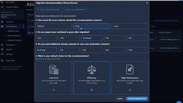 Cirrus Migrate Cloud now includes the Cloud Recommendation Wizard to provide a better, simpler way for organizations to get the right cloud storage capacity. It is a new cutting-edge capability designed to streamline block-level cloud migrations by automatically recommending the most suitable storage options with Microsoft Azure. The solution automatically recommends a volume type, size and performance parameters based on the real performance of source volume. Cirrus Migrate Cloud simplifies the decision-making process, ensures optimal performance, minimizes business disruption and reduces cloud storage costs. Cirrus Data plans to add this capability to the AWS and Oracle Cloud public clouds.