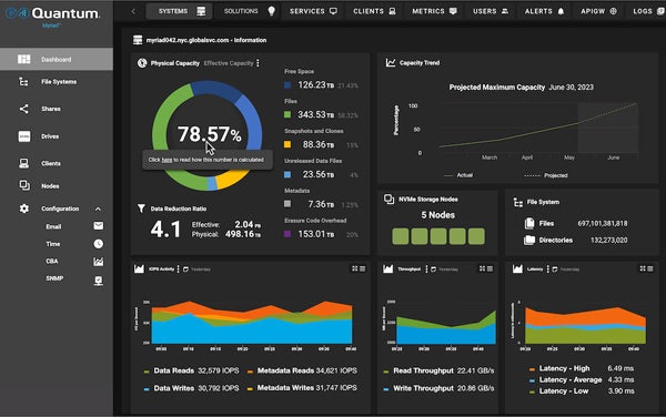 Quantum Myriad is an all-flash, scale-out file and object storage software platform built for the enterprise. With Myriad, enterprises can replace legacy disk-based storage systems with a software-defined, all-flash platform that provides faster performance, greater scale and a more sustainable and green solution that is both power- and real estate-efficient. The software is an expansion of Quantum’s portfolio of solutions for unstructured data and is ideally suited for emerging, high-growth use cases that require more performance and more scale. AI, machine learning, modern data lakes, VFX and animation are specific use cases driving the growth for scale-out file and object storage such as Myriad.