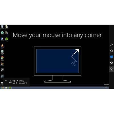 Chief among the complaints about preview versions of Windows 8 was the extreme departure of its user interface from historical Windows norms. Windows 8 still implements the Start menu as a full screen of application tiles, but the release version is far more responsive to mouse movements in the hot corners. It's also quick to point out these hot corners to users, starting with a demonstration at installation time and repeating it later with an image like the one shown. When moving the mouse pointer to a hot corner, Windows 8 quickly brings up the appropriate function.