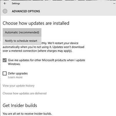 In Settings head to the Advanced Update section. Now select Advanced Windows Update options. Then, in the drop-down menu at the top, choose "Notify to schedule restart."