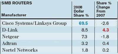 Cisco dominated the category with nearly 70 percent of the market. D-Link made a sizable gain, but still accounted for a fraction of Cisco's sales through distribution last year.