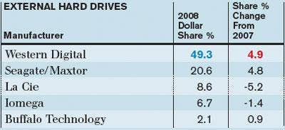 Western Digital and Seagate/Maxtor accounted for nearly 70 percent of dollars sold through distribution last year, and both companies increased their share over competitors, too.