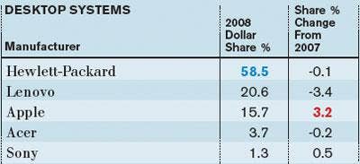 HP combined for more desktop revenue through distributors than every other vendor combined, although Apple made some market-share gains during 2008.