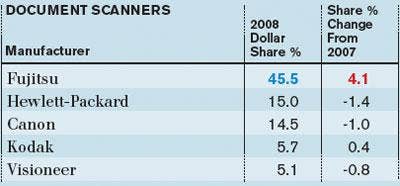 Fujitsu continued to dominate the document scanner market, accounting for nearly half of all dollars in the category, while also gaining more share at the expense of competitors.