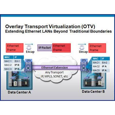 What’s OTV? It stands for overlay transport virtualization, a tongue twister that simply means the ability to treat multiple physical data centers as a single logical data center. With Cisco’s OTV, workloads that were once restricted to a local Layer 2 domain can be shifted via a Layer 3 network such as the Internet to other physical data centers for processing, regardless of location.