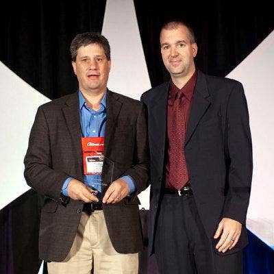 Accepting the award from CRN’s Rob Wright (left) is Genesis Networks’ Steve Seago, vice president, sales.