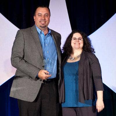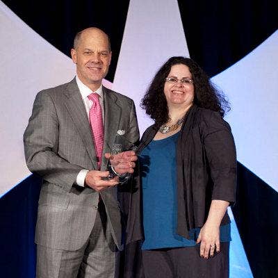 Acceping the award from CRN’s Jennifer Follett for Data Protection/Disaster Recovery is George Barkley, managing partner, Sovereign Systems.