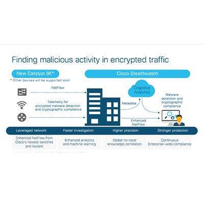 Cisco boosted its network security portfolio this year with the launch of Cisco Encrypted Traffic Analytics, which solves a growing challenge in security around threats hiding in encrypted traffic. By utilizing Cisco's Talos cyber intelligence and machine learning to analyze metadata traffic patterns, the network can identify the fingerprints of known threats even in encrypted traffic.