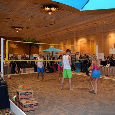 While service providers talked Gigahertz and megapixels at the Digital Experience showcase, a game of beach volleyball was happening right in the middle of the floor. The contrasting display area was all part of Pepcom's showcase theme, complete with sand, a volleyball net, and volleyball players wearing beach attire.