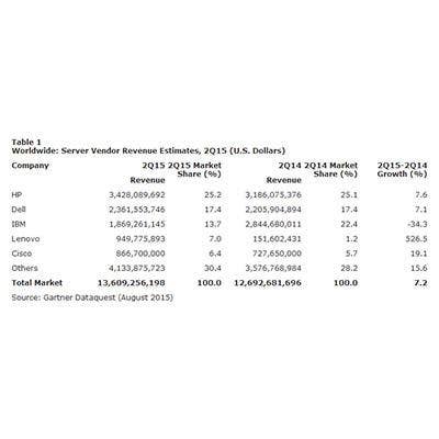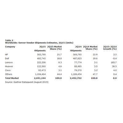 Dell kept a solid second-place position with sales of $2.4 billion, up 7.1 percent. IBM saw its sales drop more than 34 percent, while Lenovo saw its sales increase more than five times, thanks to Lenovo's acquisition of IBM's x86 server business. Hewitt told CRN that the revenue numbers take into account the server business transfer by comparing sales to last year's sales as if the server deal had already taken place in the second quarter of 2014.