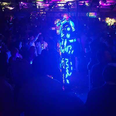 Austin is a great party city, and after hours is time for various organizations to throw down. Here, two men dressed as illuminated robots dance at a party thrown by Intel on the last night of the conference.